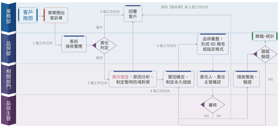 - 設立客訴及客戶產品分析系統,針對性分析每筆事件的問題原因及改善方案。
