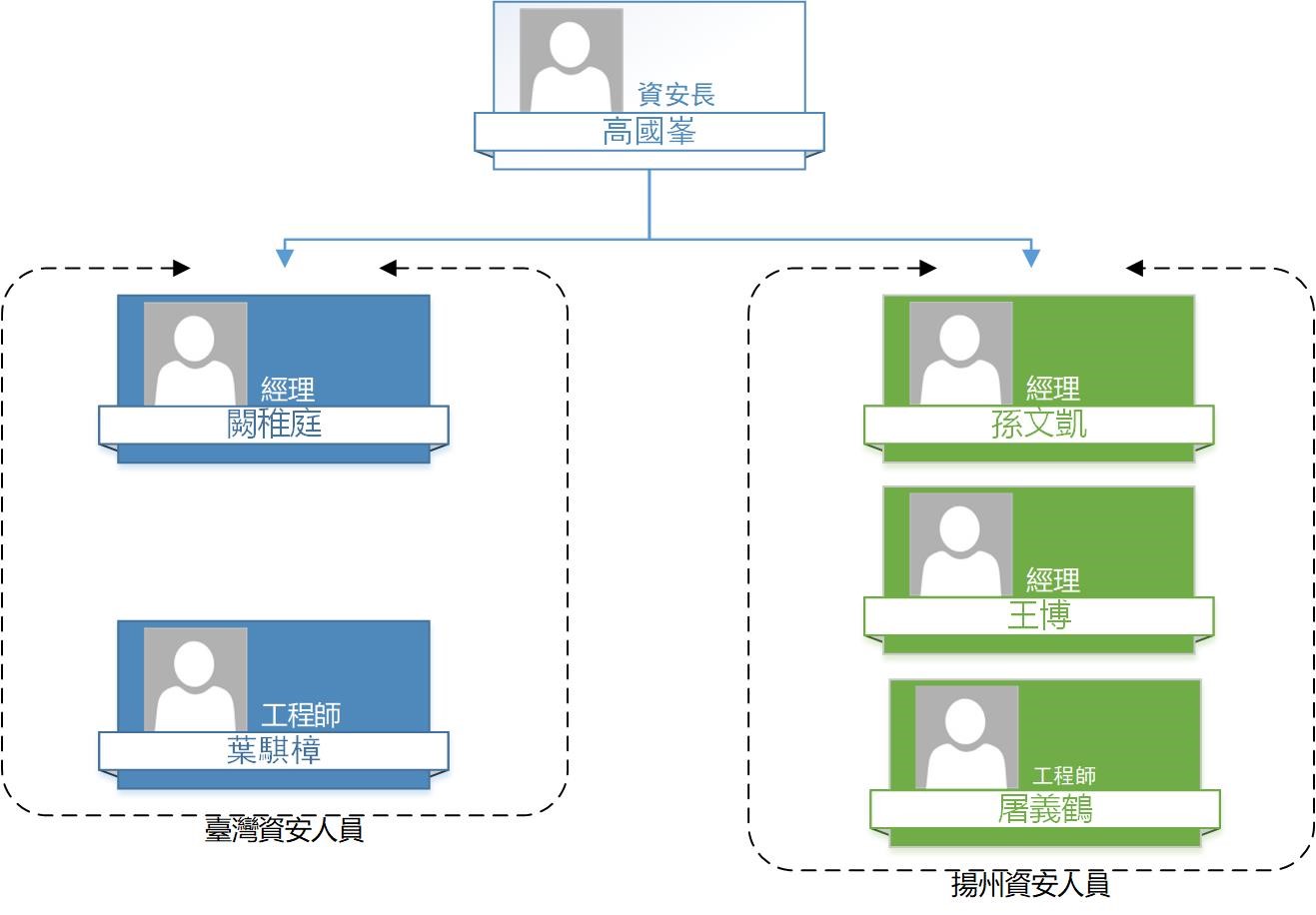 由資安長負責資訊安全政策與制度之規劃、推動、協調、監督及審查工作,資安小組成員則依職責執行各項資通安全管理事項。